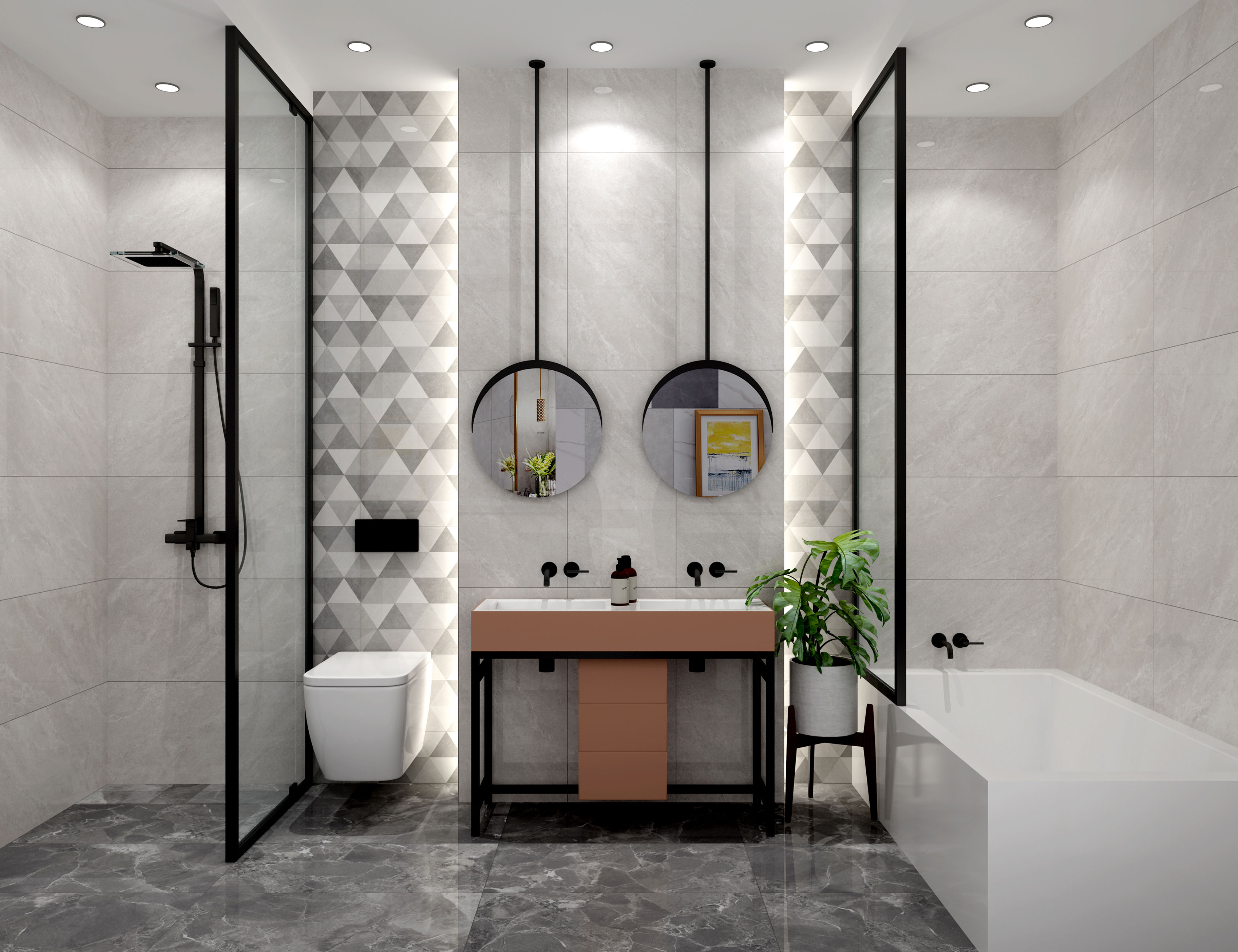 略帶一抹暖調的灰,柔和、沉靜、內斂,天然石材的原生紋理在磚面上若隱若現,塑造柔美輕盈的空間印象,凸顯不凡品位。